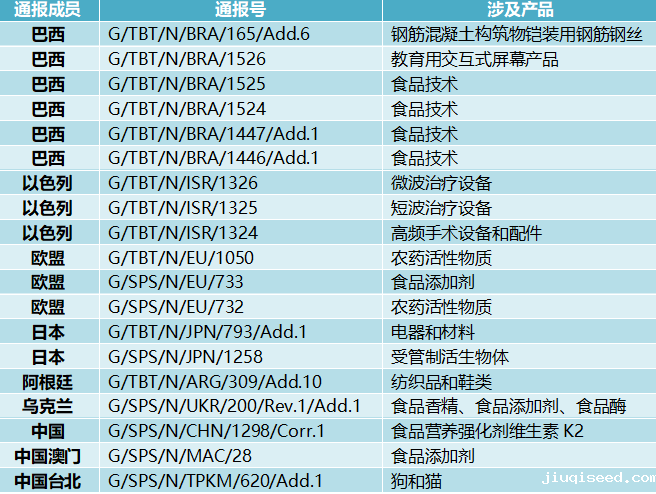 2024年3月1日,共有9个WTO成员通报19项技术性贸易措施,其中12项为TBT措施,7项为SPS措施。通报情况为:巴西6项、以色列3项、欧盟3项、日本2项、阿根廷1项、乌克兰1项、中国1项、中国澳门1项、中国台北1项。这些措施涉及教育用交互式屏幕产品,食品技术,微波治疗设备,电器和材料,受管制活生物体,纺织品和鞋类等。通报详情如图表所示。